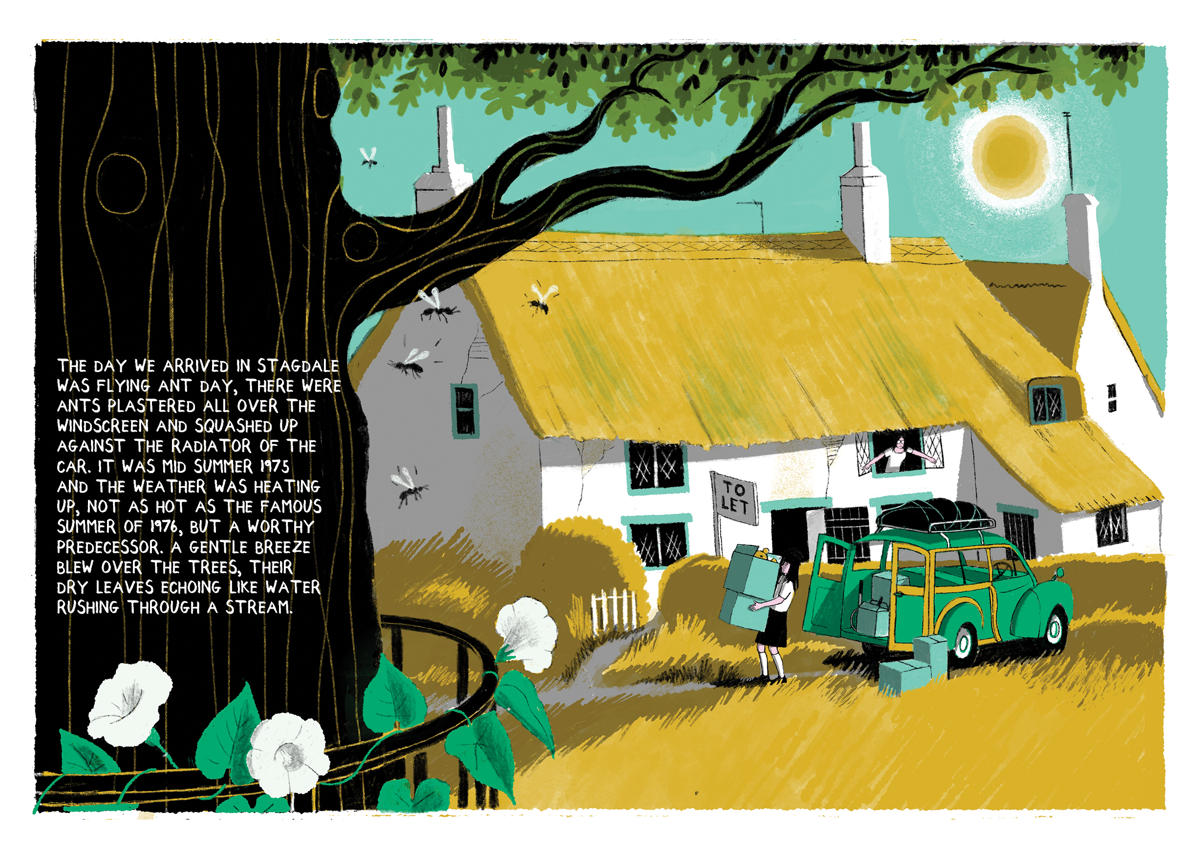 The lingering impact of the Second World War on the childhood experience of the 1970s forms an integral part of Frances Castle’s beautiful new graphic novel Stagdale. Set during the stifling summer of 1975, it sees timid, 12-year-old Kathy and her recently-divorced mother making a fresh start in the titular village, a vaguely unsettling rural outpost stuck in a disqueting torpor. It’s a community that boasts a Norman church, an annual medieval hunting ritual, and an ancient, chalk stag carved into the looming hillside, dominating the nestling huddle of tumbledown cottages below. The book captures perfectly the insularity of the textbook “creepy village”, redolent of so much classic childrens’ television of the era… as well as the suffocating stillness and silence of a 1970s school holiday. “Stagdale folk don’t tend to travel far,” admits Kathy’s new friend Joe, as the duo tramp aimlessly through a sun-dappled churchyard bristling with familiar village surnames. It’s a languid, leisurely tale, liberally dotted with totems of the era: toy Wombles, racks of Texan bars, scary, violent summer thunderstorms and a tiny museum of corn dollies and Bellarmine witch-bottles… a location in which Kathy learns for the first time the wartime story that drives the book towards a tantalising twist: the discovery of a 1938 diary behind the skirting board of her new bedroom.