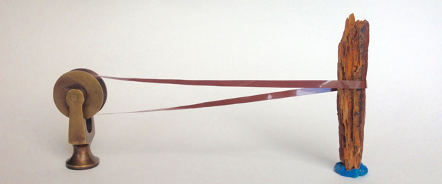 Once I had decided which sections to use, I built a Heath Robinson device that allowed the tape essentially to be destroyed by an actual piece of the Wicker Man. After that I set the wood alight, and – when cooled – crushed it to ash and coated the near-destroyed tape with it.