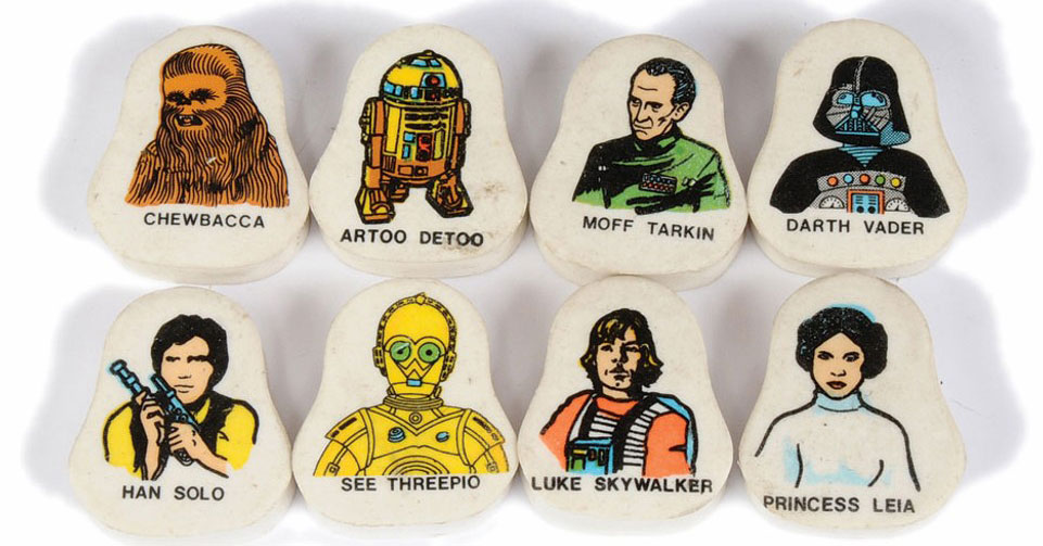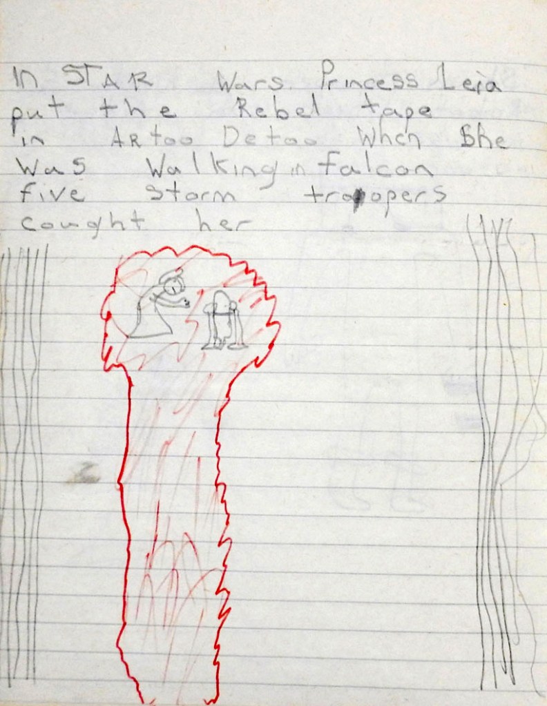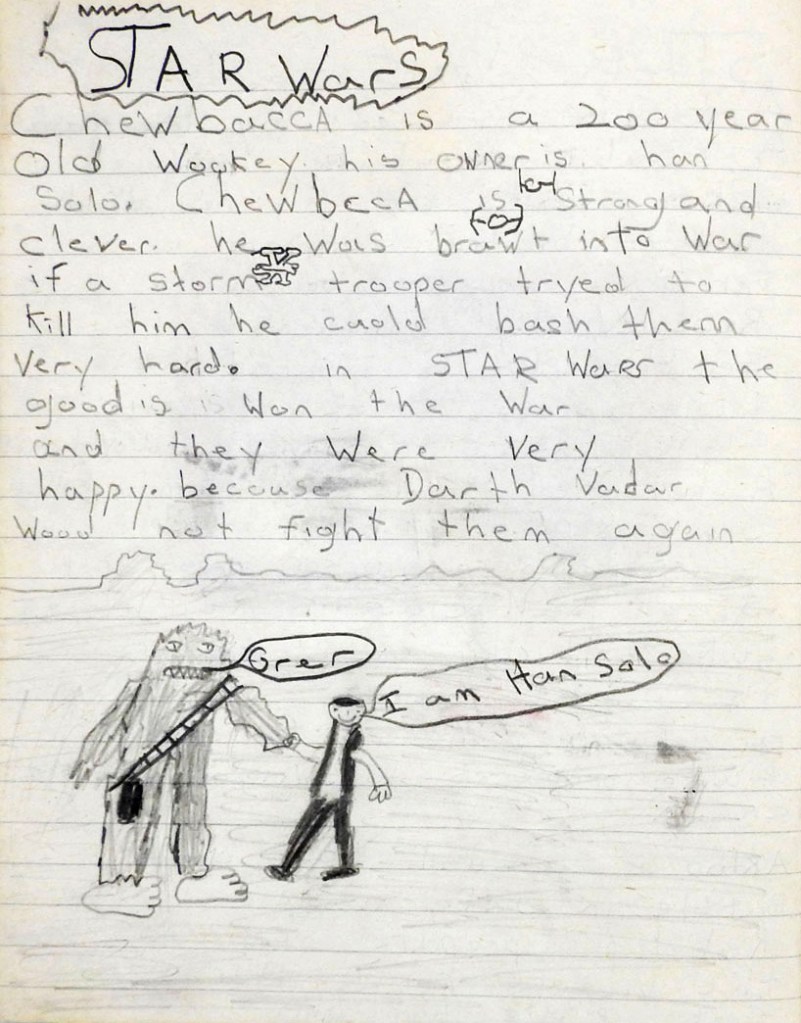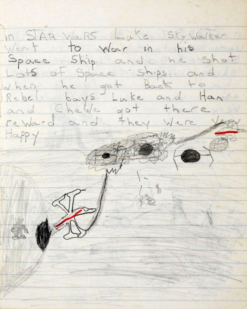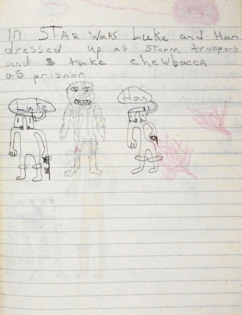 When I rediscovered and opened my Star Wars exercise book decades later, I found tiny white and coloured fragments of the rubber I had used, caught in the book’s central gutter. I’m almost sure it was a Luke Skywalker eraser, and I know I will have been conflicted over whether to use it or not: every Star Wars item to a six-year-old fan was a treasure – a holy relic – and to deface it would have been an act of heresy.”