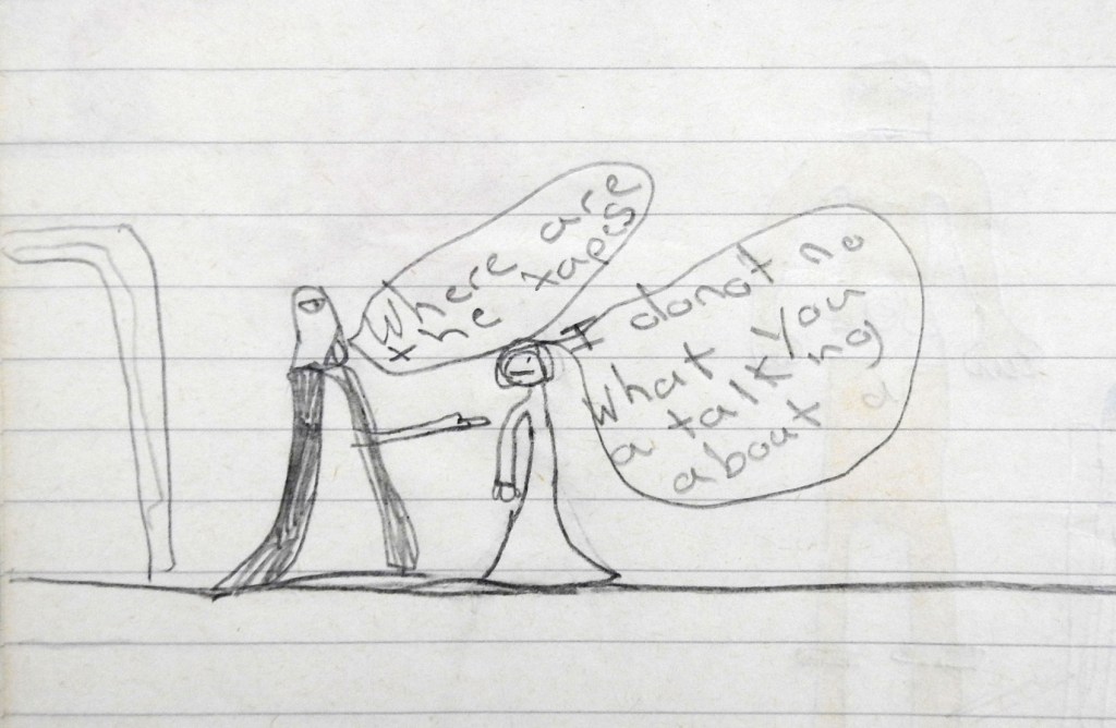Felt Trips is a collaborative effort. If anyone wants to contribute their own childhood drawings from the era, I would be utterly delighted – please drop me a line using the “Contact” link at the top of the page. A good quality scan would be perfect, but – if not – then a clear photo of your artwork, lying flat, is fine. And maybe a few words of explanation, too: when the drawings were done, how old you were, what inspired you to tackle those particular subjects? Thanks so much.
