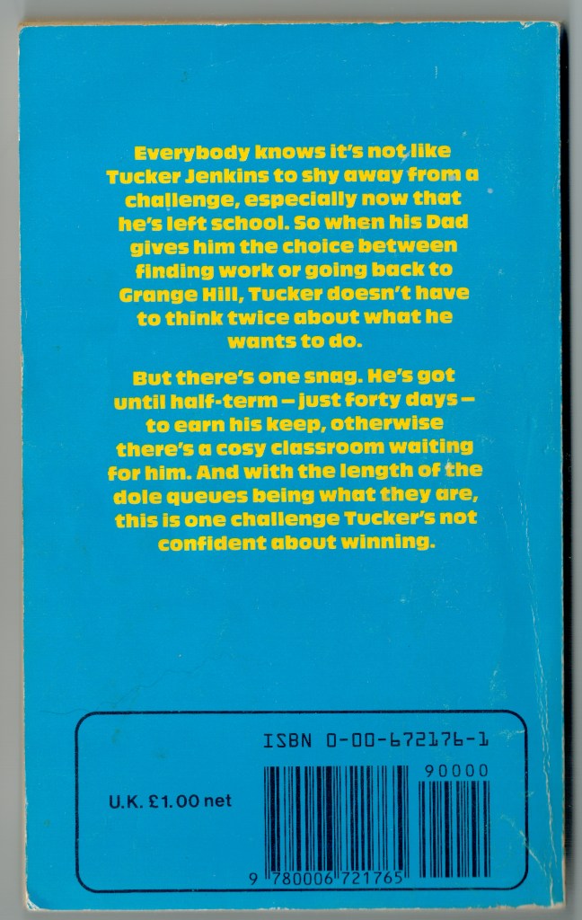 Robert Leeson‘s book is, perhaps surprisingly, not an adaption of the TV series. That book exists, was written by Jan Needle, and published in 1984. Forty Days of Tucker J. acts as a precursor to the events of Tucker’s Luck, kicking off on 6th September (presumably 1982 – overly-diligent research reveals that date was, appropriate to the book’s events, a Monday), a day that officially marks the end of the school summer holidays, and the beginning of Jenkins’ new life as an unemployed school-leaver. Living with his parents, languishing in a bedroom filled with spare motorbike parts, and drifting into a torpor of late-morning sleeping and creeping depression, he is given an ultimatum by his father. Tucker must prove, within the next six weeks, that he is capable of earning an independent living… or his parents will insist he return to Grange Hill after the October half-term to study for further qualifications.