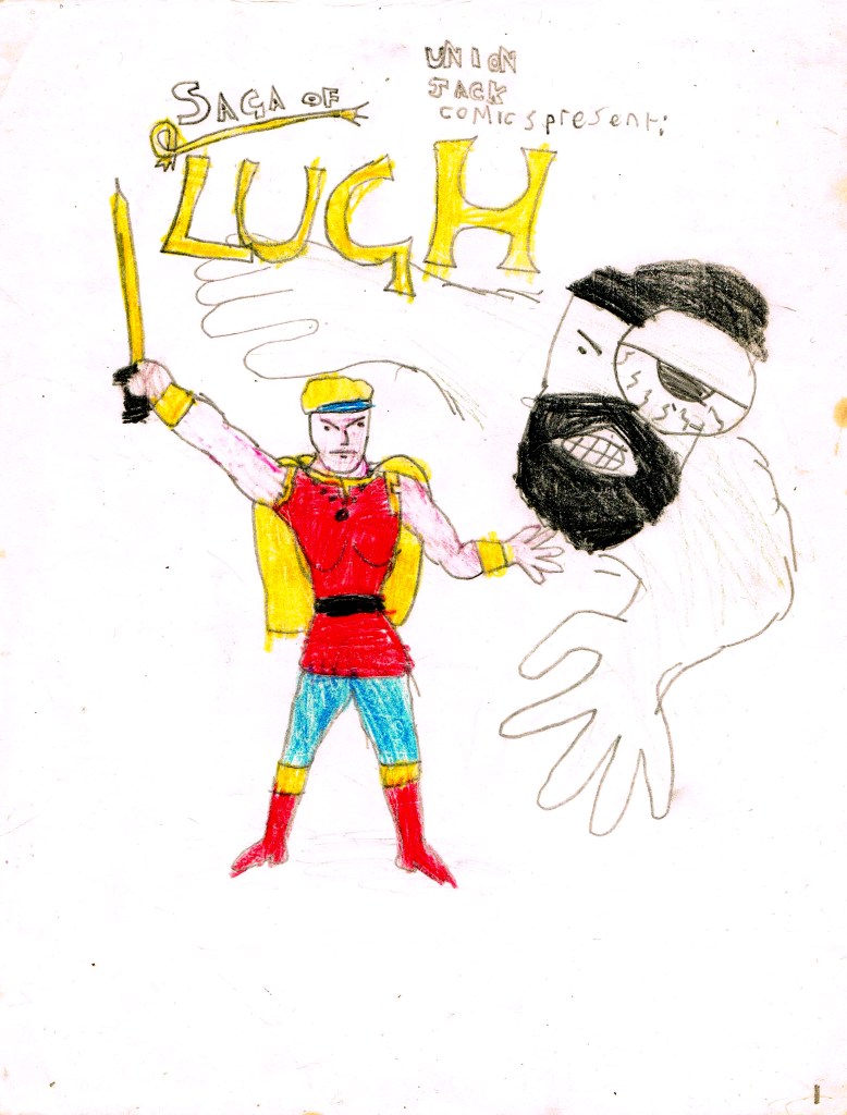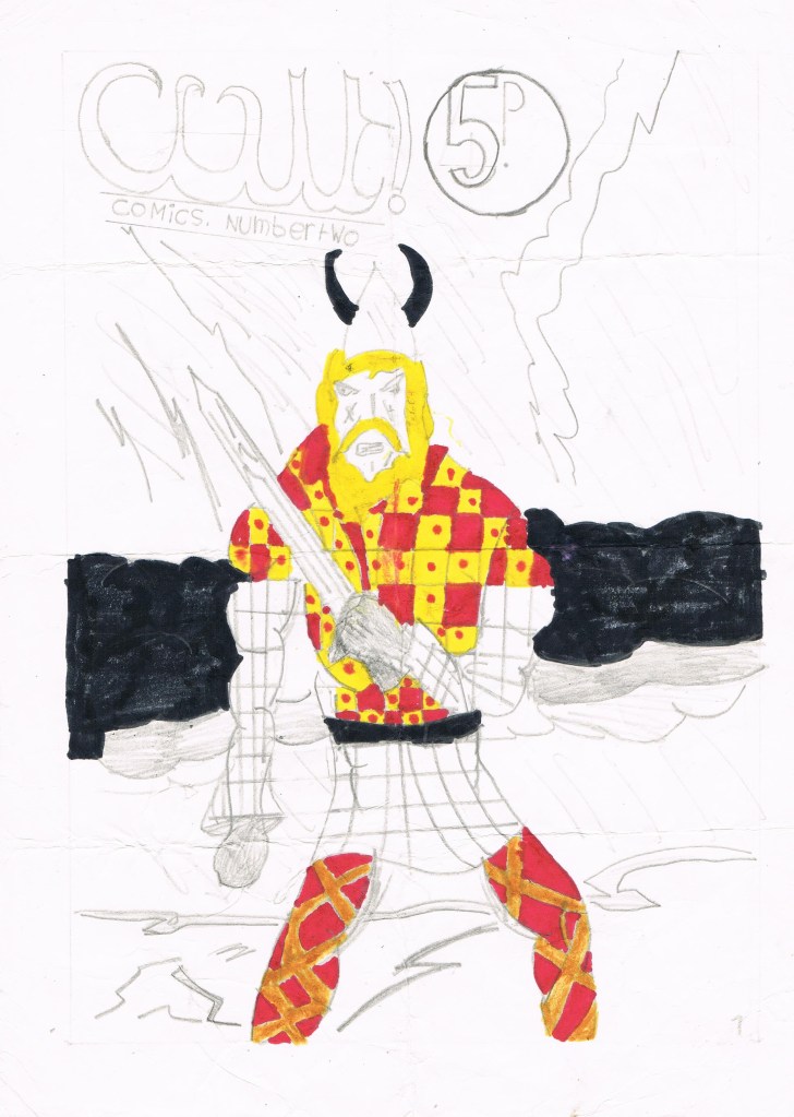The Saga of Lugh I’d say came from around the same time but – despite my regressing from felt tips to crayons for the colouring-in – it looks a little better drawn. It was virtually a graphic novel, filling the whole of a 20-page A4 sketch pad, probably drawn over one long summer holiday. 1980? I’d decided that the Irish sun god Lugh was the likeliest candidate for a Celtic superhero in the vein of Marvel’s Thor, and went ahead and did my version of his battle with the Fomorian giant Balor, who I made into a kind of Irish cyclops with one deadly eye.