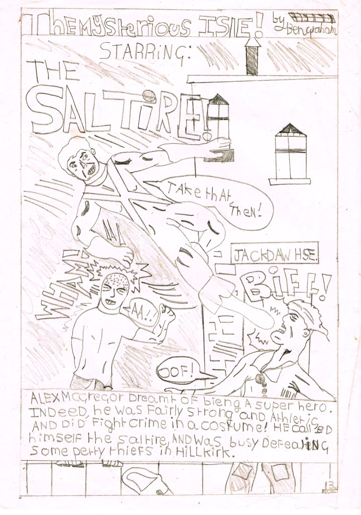 No surprise, then, that many of us attempted to create our own versions. We drew brilliantly inventive spoofs or imitations of our favourite titles: thick wodges of DIY felt-tip strips awkwardly stapled together and passed around obliging family members and friends, eagerly awaiting tacit approval. Among this teeny legion of aspiring comic book moguls was writer Ben Graham, now a writer and music journalist for the likes of The Quietus, but – during his childhood – the genius behind titles like this: