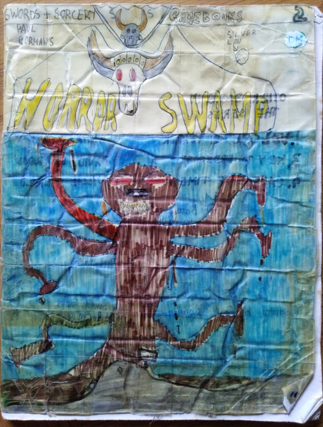 We began with plans for four books: one each. Rick’s Volcano of Terror led the way. Mine, with a cover directly copied from the Fighting Fantasy book Scorpion Swamp, was the second in the series and was called Horror Swamp. Then came David’s Key to Freedom and Will’s Caves of Time.