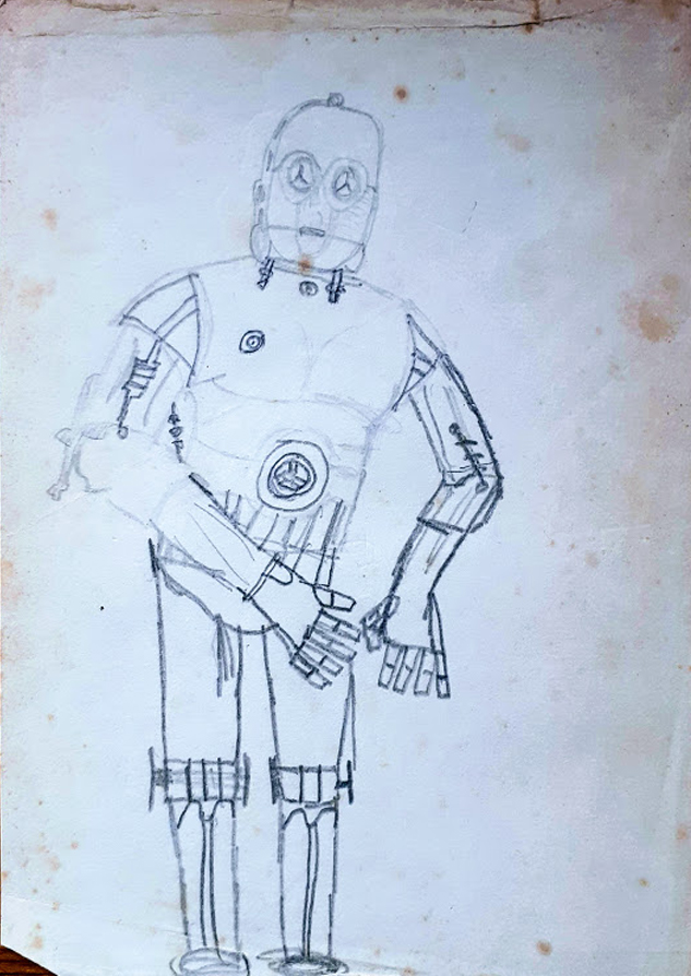 That being said, it must have made it through the mental haze of lightsabers and TIE fighters enough to have registered somewhere. As an adult I have managed to collect five different editions of the book, and recently while comparing the different copies, I found a pencil sketch of C-3PO, the second best droid in the film, on a sheet of paper that had been ensconced between the pages of the copy I received in 1977. It was a reminder that I had drawn the characters obsessively – mainly the droids, spacecraft and armoured members of the cast, as I wasn’t very good at people, and preferred the machines anyway. One of the reasons behind this infatuated scribbling was that I wasn’t receiving enough information about the subject of my hyperfocus, so I was forced into generating my own. I have no idea what befell the other pictures I drew; I suppose some of them, like this one, may still live on trapped between the pages of rarely opened books, and may yet come to light.