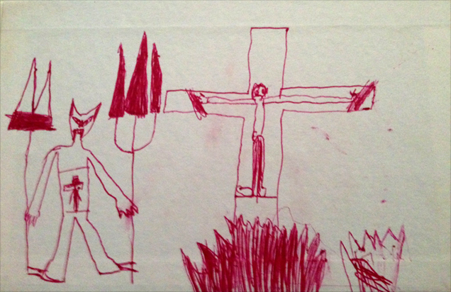 I always assume it was drawn by a boy in his sister’s book. But there may be some sort of unconscious bias there, so I do apologise if the artist is reading this and wants to put her hand up and admit to it! So where did the inspiration come from?  A ‘fire and brimstone’ talk at Sunday School? A brief glance at the TV, asking for a glass of water while Mum and Dad were watching Race With the Devil or Rosemary’s Baby on a Saturday night? I have spent far too much time trying to work out whether it’s an image from a film, a book or just a figment of an overactive imagination.  It looks familiar, but maybe that’s because I’ve spent far too much time looking at it…