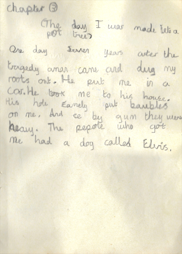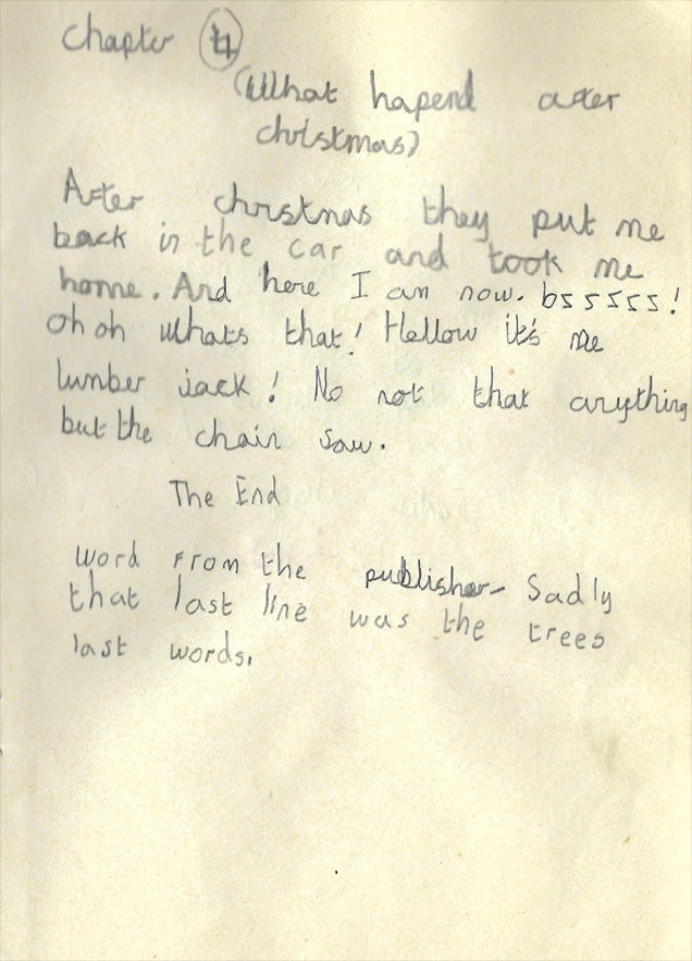 “My memory is notoriously poor, but fortunately The Sad Story of the Christmas Tree features a date on the back: December 25th, 1995. This means I would have been eight years old when I wrote and illustrated it, and only a month shy of turning nine. For some reason, I thought I was younger – it’s probably the penmanship!
