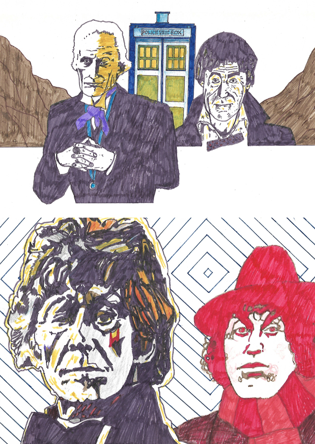 William Hartnell was referenced from David Whitaker’s Doctor Who and the Daleks novelization, but I don’t recall where the picture of Patrick Troughton came from. Jon Pertwee and Tom ‘Chinny’ Baker were referenced from the St. Michael Doctor Who and the Daleks Omnibus book I had owned since 1976. The absence of Baker’s chin on the cover of the book may explain my struggle with his jawline!