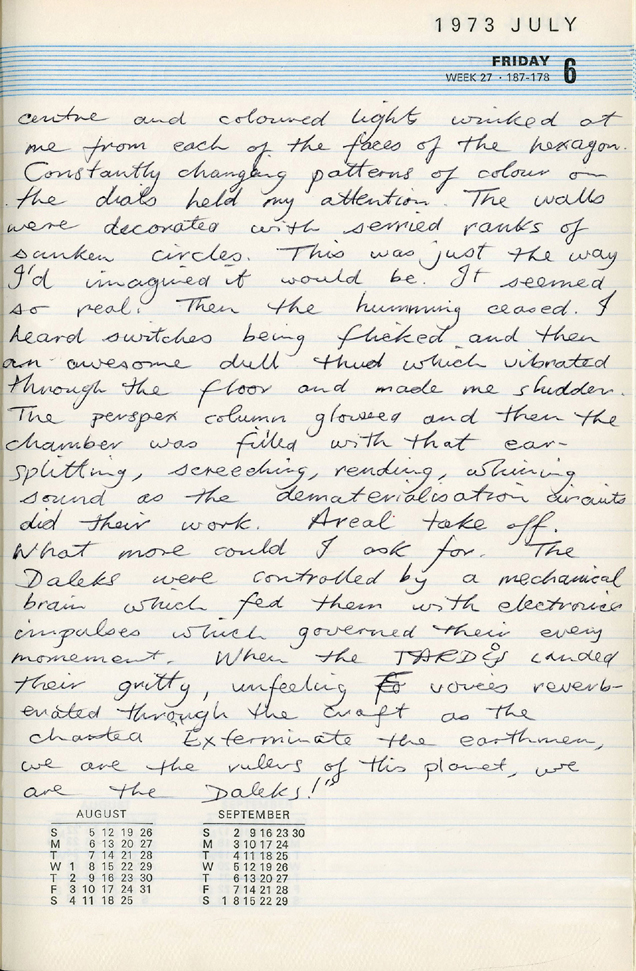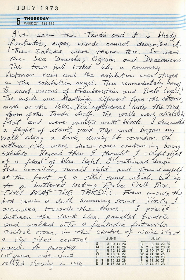 Or, to quote Bob’s breathless diary entry for Thursday 5 July 1973: “I’ve seen the TARDIS and it is bloody fantastic”.
