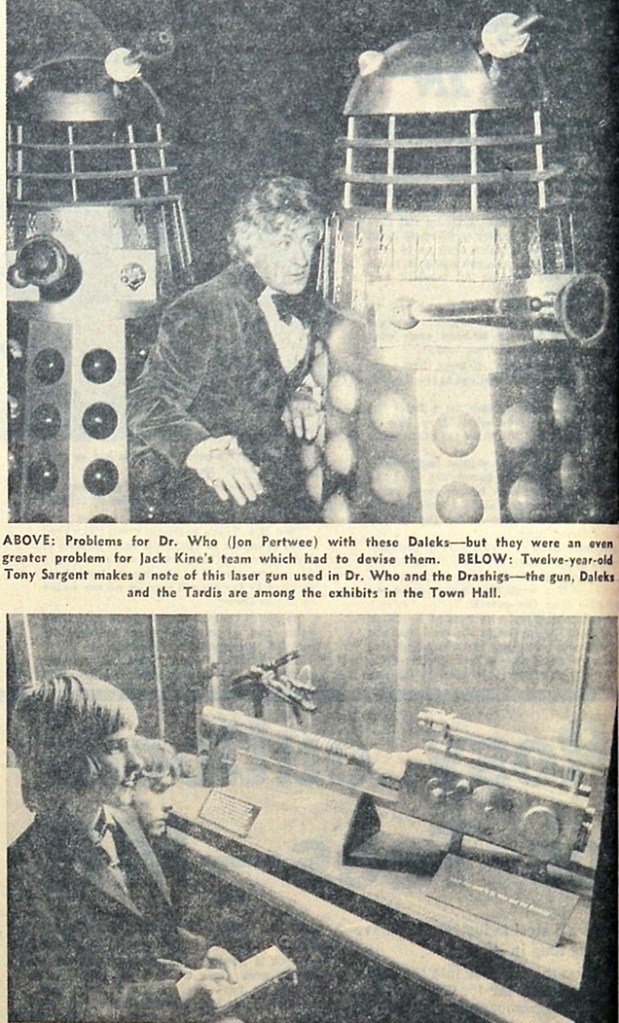 It had been a stressful day for the incumbent Doctor, whose flight to Teesside Airport was delayed for an hour. “The TARDIS is a lot more reliable than the airlines,” he quipped to The Journal newspaper – which also reported that, afterwards, Pertwee was jetting straight out for a holiday in Ibiza. Nevertheless, he found time to greet press and fans alike inside Middlesbrough’s Town Hall, and local legend maintains he also expanded his collection of vintage glassware with a visit to Mona Taylor’s antiques shop on nearby Gurney Street.