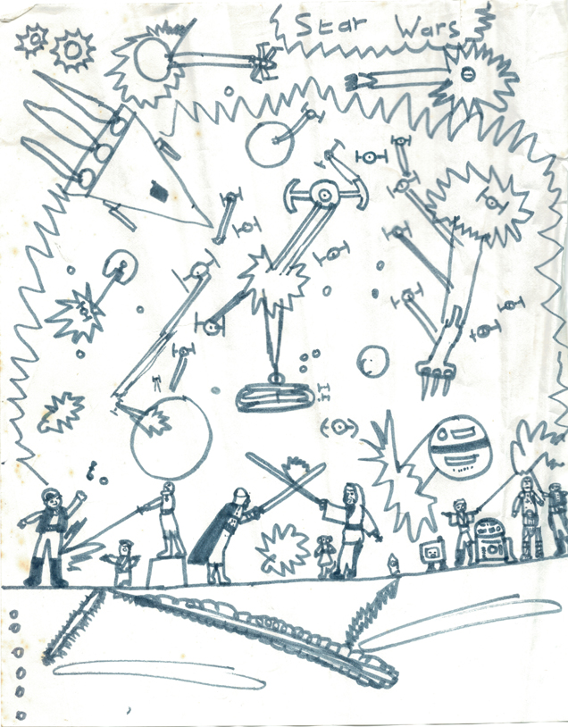 And above them? Every bloody spaceship I could draw. TIE Fighters, X-Wing Fighters, Star Destroyers, the Millennium Falcon, the Rebel Blockade Runner and – slap bang in the middle of it all – what looks curiously like the Box of Delights, but with the ability to take down the lot of them.