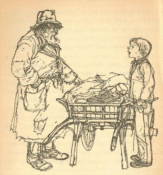 “Henry went right to the farthest side of the park, where narrow paths twisted among the shrubbery. He had given up hope. And then he rounded a sudden corner, looked up and saw the tramp. Sun struck the dew that glinted on his hair and beard. Wild, wicked and impossible he loomed among the clipped, self-respecting laurels”.