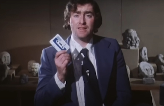 And that mysterious cassette tape? It’s used by Luke Casey to illustrate his own Stone Tape theory. “Can it be possible that horrible experiences that happened thousands of years ago can somehow be imprinted or recorded in a stone head and then sort of played back when something comes along to trigger them off?” he asks Nationwide viewers. “It sounds fanciful in the extreme, but then supposing somebody had told one of the great composers that – hundreds of years after his death – an entire symphony could be captured on a little thing like this…”