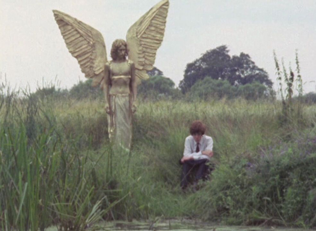 On screen, the road closure is the result of a mysterious incident in which a teenage merrymaker is badly burned while stopping for a pee on a late-night joyride, and there are rumours (notably aired in a terrific parish council scene worthy of Alan Bennett) that a top-secret nuclear facility is being constructed beneath the hills. Stephen’s inquisitive trespassing past the “NO ROAD TO PINFIN” sign is symptomatic of his own emerging inclination to question authority, and he is rewarded by the visitation of a towering golden angel at the roadside.